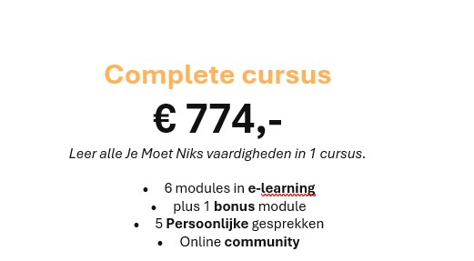 Voor Je Moet Niks-training, inclusief online cursus en vijf sessies met mij als je Je Moet Niks-trainer, is jouw investering €774. Je investeert niet alleen in een cursus, maar in je mentale fitheid – en daarmee in een leven waarin jij weer aan het stuur staat.